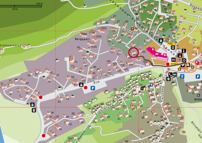 Beim orangenen Kreis, gegenüber der Talstation der Belalp Bahnen, befindet sich das Büro Beltour. Von dort aus begeben Sie sich zirka 100 Meter talabwärts. Auf der rechten Seite neben dem Residence Panorama (2 identische Häuser), führt ein Fussweg hinauf (Weg zum Haus ist autofrei). Beim roten Kreis befindet sich das Haus Mischi. Die Wohnung befindet sich im Obergeschoss (Hochparterre, links vom Haus führen Treppen zum Eingang der Wohnung)