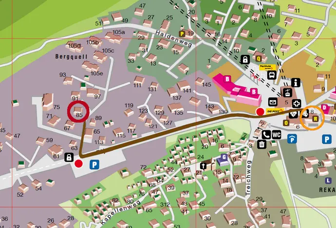 Beim orangenen Kreis, gegenüber der Talstation der Belalp Bahnen, befindet sich das Büro Beltour. Von dort aus fahren Sie zirka 300 Meter talabwärts und biegen nach rechts ab. Nach zirka 50 Metern liegt das Haus Rosenhof auf der linken Seite beim roten Kreis. Das Auto kann vor dem Haus parkiert werden (Bitte nahe zur Treppe).