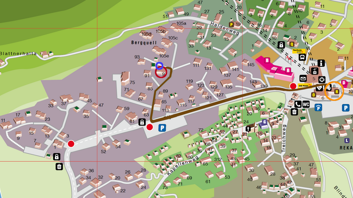 Beim orangenen Kreis, gegenüber der Talstation der Belalp Bahnen, befindet sich das Büro Beltour. Von dort aus fahren Sie zirka 300 Meter talabwärts. Auf der rechten Seite befindet sich ein Wegweiser mit der Aufschrift "Bergquell". Nach zirka 150 Meter erreichen Sie beim roten Kreis das Haus Konkordia. Beim blauen Kreis, direkt vor dem Haus, können Sie einen Parkplatz nutzen. Die Wohnung befindet sich im zweiten Stockwerk.