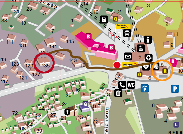 Beim orangenen Kreis, gegenüber der Talstation der Belalp Bahnen, befindet sich das Büro Beltour. Von dort aus begeben Sie sich zirka 100 Meter talabwärts. Auf der rechten Seite neben dem Residence Panorama (2 identische Häuser), führt ein Fussweg hinauf (Weg zum Haus ist autofrei). Beim roten Kreis befindet sich das Haus Leone. Die Wohnung ist über den linken Balkon des Hauses erreichbar (direkt vom Weg aus und nicht die Treppe hinauf).