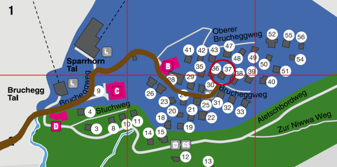 Das Chalet Allegra ist bequem über die grosse Seilbahn der Belalp Bahnen erreichbar. Von der Bergstation aus folgen Sie dem Weg nach rechts. Nach etwa 10–15 Minuten Fussweg gelangen Sie ins Gebiet Bruchegg.