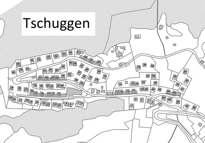 Im Winter gelangen Sie mit der Seilbahn der Belalp Bahnen zur Mittelstation Tschuggen. Von dort aus laufen Sie zirka 15-20 Minuten zum Haus. Das Haus Nr. 75 finden Sie beim roten Kreis.