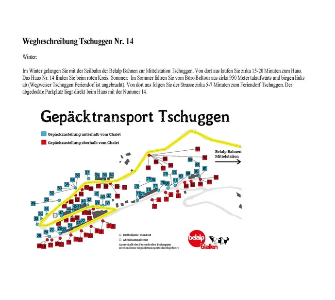Im Winter gelangen Sie mit der Seilbahn der Belalp Bahnen zur Mittelstation Tschuggen. Von dort aus laufen Sie zirka 15-20 Minuten zum Haus. Das Haus Nr. 14 finden Sie beim roten Kreis.